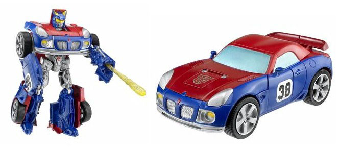 - A redeco of "Ion Blast" Autobot Jazz, "Sonic Shock" Smokescreen sports a red and blue colour scheme based very closely upon Generation One Smokescreen. In vehicle mode he's kind of a squat and cutified Pontiac Solstice, while in robot mode he bears a decent resemblance to various Generation One hood-chest Transformers. Amusingly, Fast Action Battler Smokescreen's head is mounted on a piece of plastic extending from the roof/windshield piece, just like the Generation One toy. His articulation is limited to his shoulders, hips and knees, and he has a missile launcher in place of his left hand.