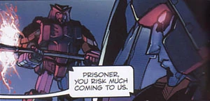 Later, at the beginning of the war, as the Decepticon movement was just beginning to reveal its true menace, Straxus returned to Cybertron for some reason to work security at the Kaon Security Headquarters. When the Decepticon Starscream was brought to trial before an emergency session of the Kaon Council, the accused started a prisoner revolt. Megatron Origin