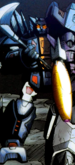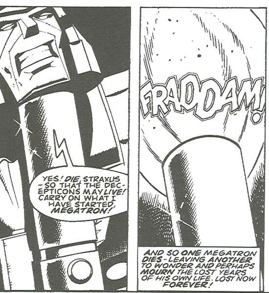 This Megatron proceeded to battle Galvatron Altered Image, and then sided with him to battle Autobots of the present and future in the "Time Wars". Time Wars Faced with destruction on all sides, the Megatron clone opted instead to return to Cybertron, where he dethroned the decadent ruling Triumvirate and took control of the Decepticons on the planet once more. The Rise and Fall of the Decepticon Empire Soon, however, he began to suffer from nightmarish visions of the lives lived by both the trooper whose body became his, and of Straxus, just as the true Megatron - having recovered his memories after a period of wandering amensia in the Dead End - attacked his base. Mind Games The two Megatrons battled, with the true one revealed the clone's nature to him, and all at once, everything made sense to the clone. Along with this revelation, another immediately arose - Straxus's mental defeat was a sham, and he had been dwelling within the clone's mind all along, steadily growing in power as the clone weakened. Straxus made one final attempt to seize control of their mind, and the clone committed suicide, blowing his own head off with his fusion cannon, rather than allow Straxus to win. Two Megatrons