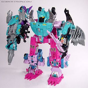 A redeco of the Generation One mold above, Timelines Overbite was available exclusively as part of a Official Transformers Collectors' Club-exclusive giftset containing all six Seacons in new color schemes. He is once again depicted as the left leg of the combined super robot.