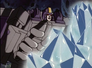 On Titan, Jero leads the Decepticons to a cave full of energy-rich crystals. Astrotrain forces the Titans to harvest crystals and carry them to the temple.