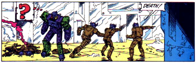 - Little character moments and jokes can be seen in the page 4-5 splash. Bludgeon is grimly cleaning his sword; Nightbeat has noticed the Neo-Knights helicopter that he brought with him; Dreadwing is ignoring the speech to tell Darkwing a funny joke, which confuses Sureshot and annoys Highbrow and two other Autobots (one who's being held back by the other); an Autobot in the back is pretending to shoot Soundwave; Starscream is looking at his woozy "ally" Shockwave with contempt; Apeface is peeling himself a yummy banana, much to Horri-Bull's amusement; and Triggerhappy is looking the other way entirely for no reason.