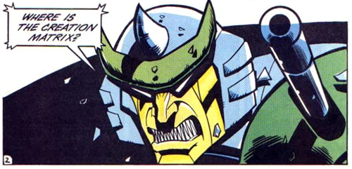 As it happened, between the revival of the Kludd and the arrival of Thunderwing, the Creation Matrix had become warped. Thunderwing fought intensely with Bumblebee, Jazz, and Grimlock on VsQs, and they were overwhelmed not only by his vastly superior might, but by the strength of his desire to possess the Matrix. However, he and his troops were subdued by a Matrix Spawn, a darkly-evolved creature contaminated by the Matrix, allowing Bumblebee and the other Autobots to grab the Matrix and head for their ship. But when the Autobot shuttlecraft later arrived within the Ark, it was Thunderwing who emerged, in full possession of the Creation Matrix, enshrouded in its energies. Dark Creation