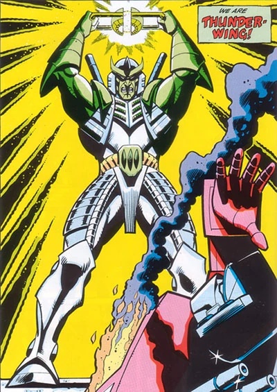 - Thunderwing only transformed out of his humanoid shell mode once in the entire United States run of the Marvel Comics series. Even then, it was into his non-combined shell-only jet mode, leaving no hint that he had an inner robot mode at all. The only time we see his inner robot mode is in his first appearance, the Marvel United Kingdom story, "The Big Shutdown!".