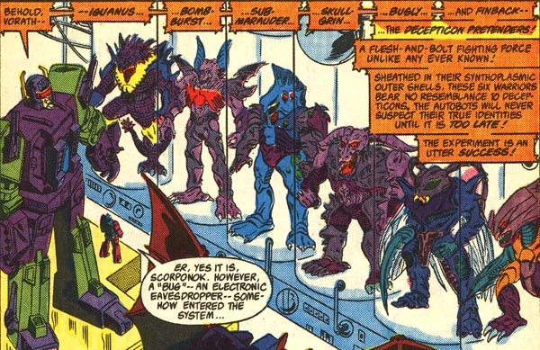 - The comic issue "Pretender to the Throne!" features Scorponok proudly creating the Pretenders, gloating that they will hide the Decepticons' identities from the Autobots "until it is too late". Not only does the plan not actually work, it's also a plot point with absolutely zero lead-in or build-up -- at no point has Scorponok ever expressed concern about his troops being detected by the Autobots, and we've never even met the Pretender characters before. It was brought about solely because the new toys had to be jammed into the story. The plan makes even less sense when you consider that the Pretender shells are giant monsters, not exactly typical of Earth. Even with Grimlock in a position of power, the Autobots would probably have been able to work out that the giant monsters trying to steal energon from Earth in the exact same way as the Deceptcons MIGHT be connected to them.