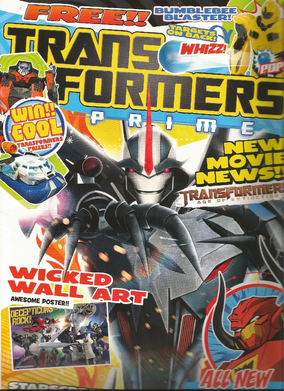 - FREE!! Bumblebee Blaster — a toy Bumblebee that shoots plastic balls. The back cover has Decepticon targets that you can cut out and shoot