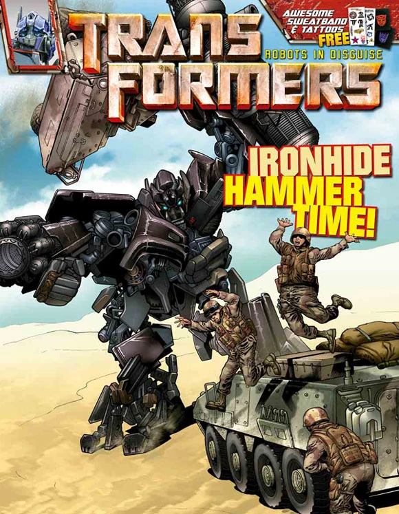 - "Awesome Tattoos & Sweat Band!" - Temporary Autobot or Decepticon related tattoos/stickers and a sweatband with an Autobot or Decepticon insignia. Whether you get an Autobot or Decepticon set depends on which issue you bought, with both being printed in equal numbers. The labels ask "Who's [sic] Side Are You On?".