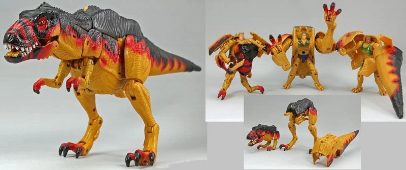 The sole combiner and Super Class figure released in the Animorphs toyline, Tri-Rex was only available as a giftset including Jake, Marco, and Cassie. Each figure transformed from a dinosaur/human hybrid into a section of the dinosaur; Jake formed the head/neck/arms, Marco formed the legs/midsection, and Cassie made the tail/spine. The toy featured an impressive amount of articulation in the combined form and even boasted electronic functions in the form of a button-activated roar (seemingly identical to the Godzilla roar sound effect) and stomping sounds when the legs were pressed in. The tail is made of a soft rubbery plastic and features a simple 'bend-and-release' whipping gimmick