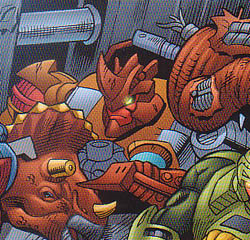 Triceradon is not the smartest Dinobot around. Making up for this, however, is his very amiable, truly friendly nature and his titanic strength in battle. Those qualities are what lead T-Wrecks to make him second-in-command of the Dinobots.