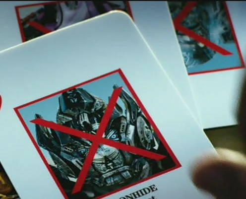 - In Age of Extinction, when Harold Attinger throws a few cards with a few Autobot faces on them, his is on of the ones with a giant red "X" across it.
