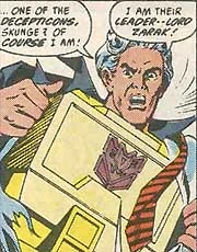 Lord Zarak was a vile dictator, the leader of the Hive, a group of telekinetics who have enslaved the population of Nebulos. While the Hive could not control Transformers as they could normal machines, Zarak nonetheless used his machines to capture and bully the Decepticons into supplying Headmaster and Targetmaster forms for the other ten members. The Rebirth, Part 2